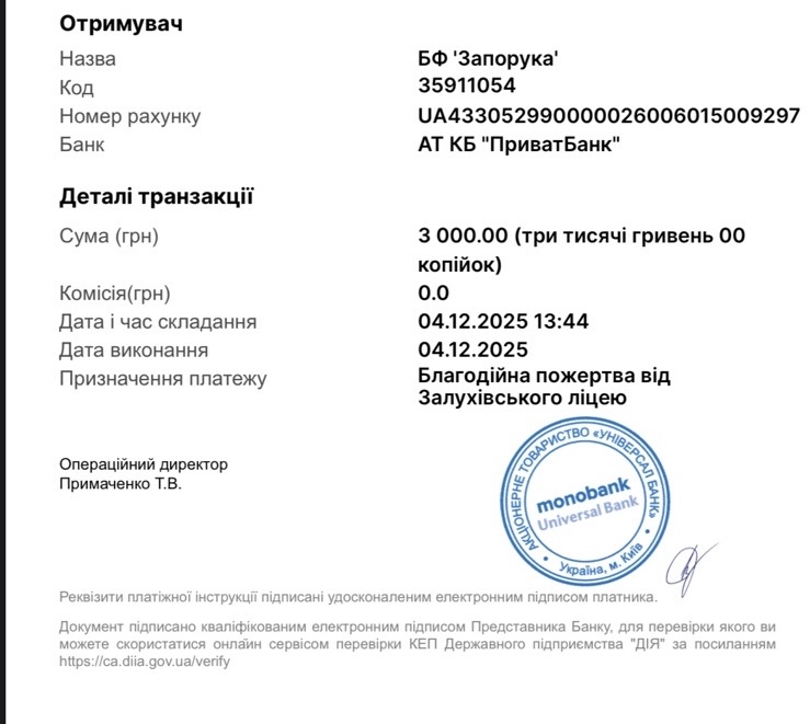 Учні, батьки та працівники закладу активно долучилися до доброчинності — разом нам вдалося зібрати 3000 гривень, які вже передано на рахунок благодійного фонду.